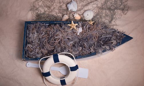 Cette version de notre décor de pêcheur permet à votre petit marin de rester coucher sur le dos le temps de la séance.